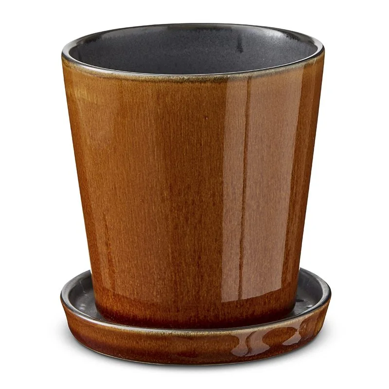 Bitz urtepotteskjuler/ krydderiskjuler i stentøj med matchende underskål har blank, farvet glasur på ydersiden og mat sort glasur indvendigt. Skjuleren er 10 cm diameter og 10,5 cm høj Underskål diameter 10,5 og højde 1,5 cm