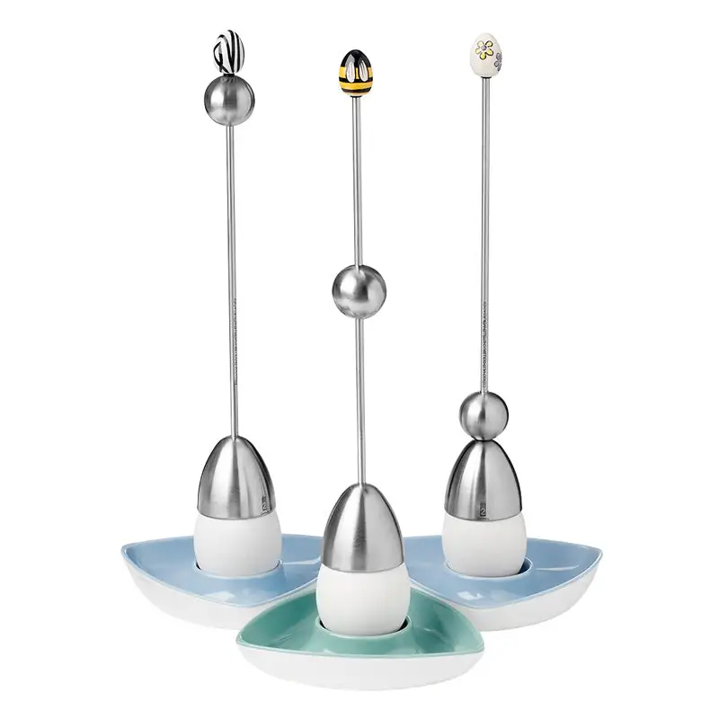 Clack placeres på det blødkogte æg, metalkuglen slippes og rammer ned på metalhætten. Derefter fjernes Clack og toppen af ægget skæres nemt af med en kniv. Vist med 3 stk – der leveres 1 stk.