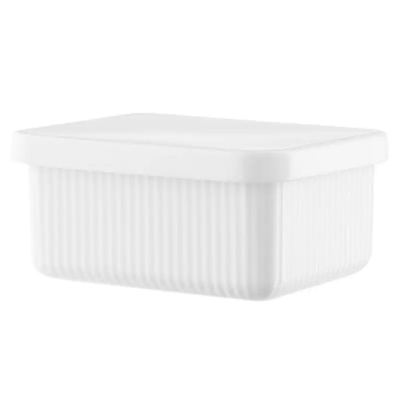 Smørboks. 2 måder at servere smørret på – låget kan enten bruges som top eller bund. Porcelæn med flotte riller – der er med til at danne en flot ramme og fremhæve anretningen. Tåler maskinopvask, frys, ovn og microbølgeovn. 10års porcelænsgaranti.