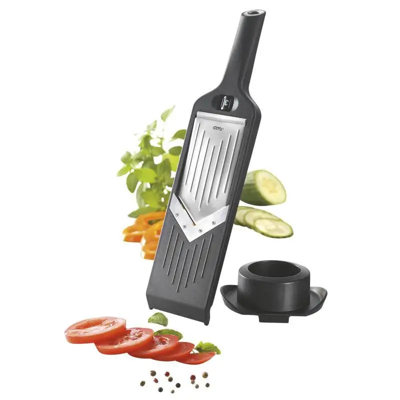 Håndholdt mandolinjern med udskifteligt V-skær, der kan skære skive i 1-5 mm tykkelse. I stål og ABS-plast. Tåler maskinopvask.