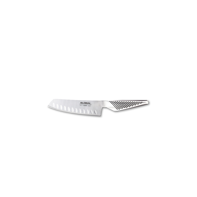 GS-91 Grøntsagskniv er skabt med Granton-skær –også kaldet ’luft-skær’. Mønstret er udformet, så råvarerne nemt slipper bladet. Det høje, let buede blad giver plads til at støtte med knoerne, så du får en god kontrol over kniven, der kan føres i en vuggende bevægelse hen over skærebrættet uden at løfte den. Kniven har et blad på 14 cm.