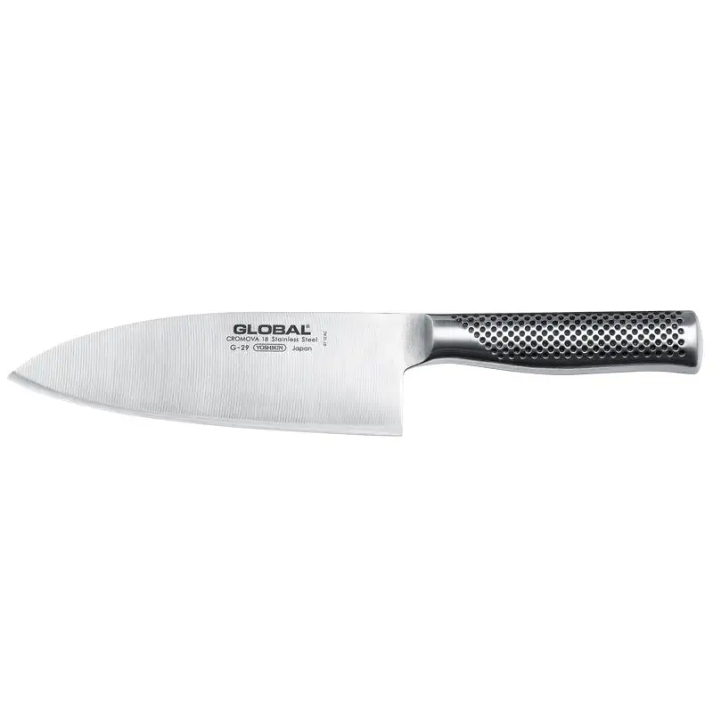 Global kød- og fiske kniv. Kniven har et større håndtag end de almindelige Global knive. Med det større håndtag og knivbladets udformning er denne kniv iddel til, at hakke både fisk og kød. Kniven bør ikke kommes i opvaskemaskinen men rengøres med varmt vand og opvaskemiddel