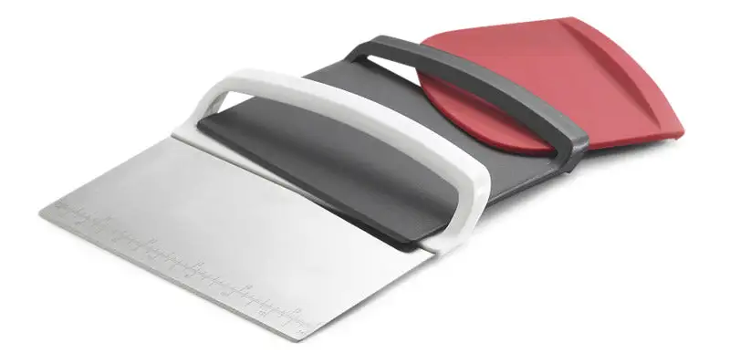3-i-1 redskab: rød dejskraber, sort redskab til opsmøring af kager og dejskærer som skærer/deler dej med måleenheder.H13 x B14,5 cm. Rustfrit stål og silikone.Tåler maskinopvask.Rød/sort/stål.