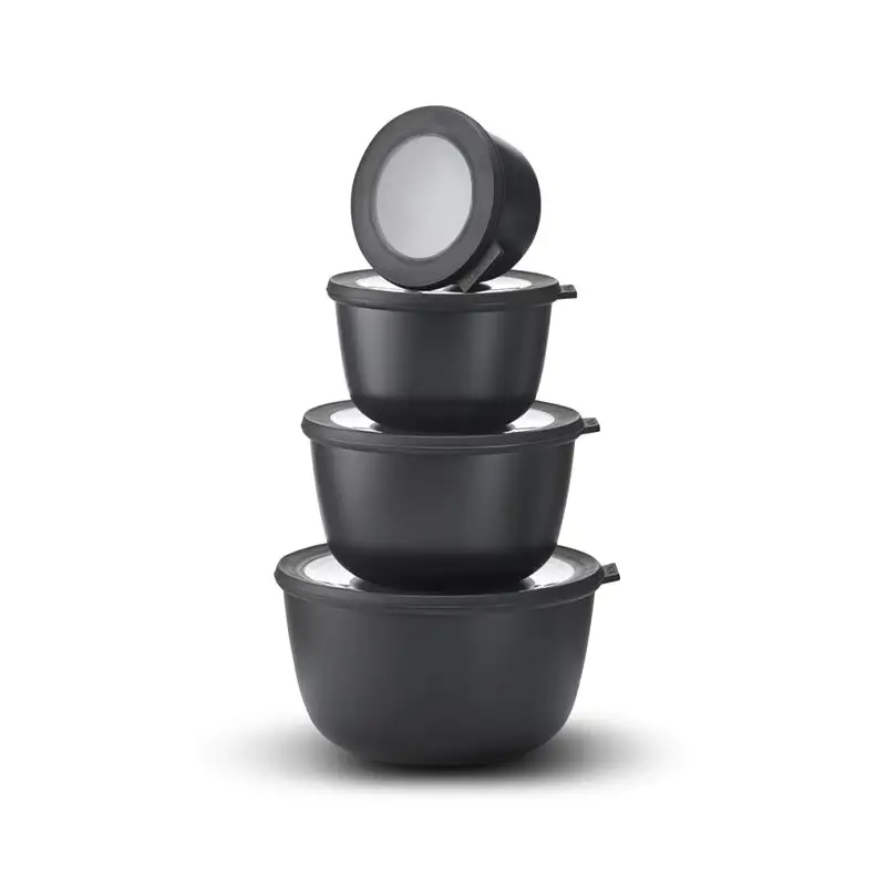 Mepal cirqula skålesæt i 4 størrelser med låg.0,5 ltr, 1,0 ltr, 2 3 liter.Fryseegnet ned til -20 °CKan anvendes i mikroovn – uden låg op til 110 °CTåler maskinopvaskMepal Cirqula opbevarings- og serveringsskål – rummelig, praktisk og dekorativ i kølige, nordiske farvetoner.Mepal Cirqula skålen er en handy all-round skål, som kan bruges til fødevarer både i køleskabet og køkkenskabet. Samtidig er den dekorative skål også velegnet til servering.Skålen kan bruges i fryser ned til -20 grader, i mikroovn og kan maskinopvaskes. Opvarmning til maks. 110 grader og uden låg.Udformningen af skålen gør, at den er let at stable og de tomme skåle fylder derfor ikke meget i køkkenskabet.Skålens låg har et transparent vindue, så man let kan se indholdet og det tætsluttende låg gør skålen vandtæt. Materialet er PP-plast, et robust og slagfast materiale, som holder til det meste.