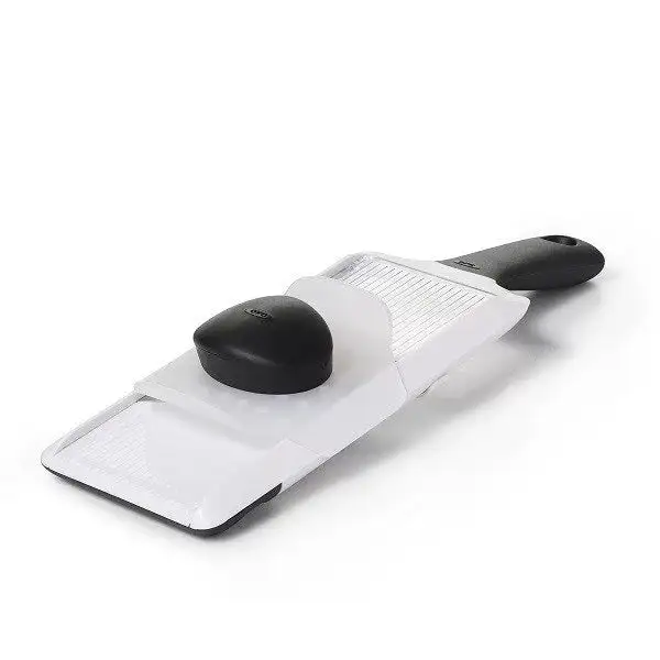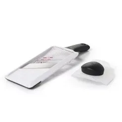 Mandolinjernet kan lægges over en opbevaringsbeholder eller køkken-skål, imens grøntsagerne rives.