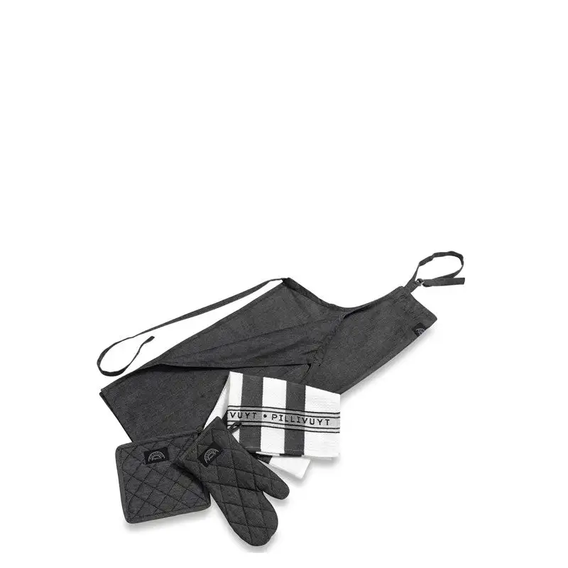 Pillivyut tekstilsæt med 6 dele. 2 viskestykker, 2 grydelapper, grillhandske og forklæde. Grå/hvid.