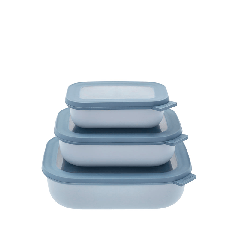 Låg medfølger. 3 skåle i forskellige størrelser – 0,5, 1 og 2 liter. Tåler maskinopvask samt mikroovn.