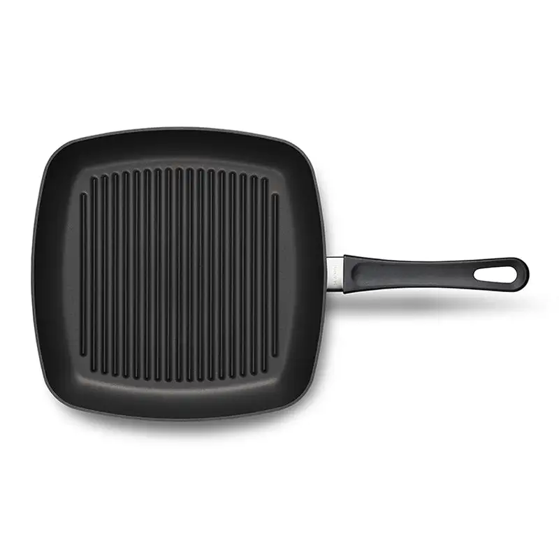 Scanpan Classicinduction grillpande27x27 cmGrillpanden har høje spide grillribber der er med til at give maden sprøde, velsmagende og dekorative grillstriber.I det maden løftes fra selve panden grilles kødet eller grøntsagerne frem for at “koges” hvilket kan ske på en almindelig pande.Panden har en non-stick belægning der gør den nem at rengøre.Til alle komfurtyper – også induktion.